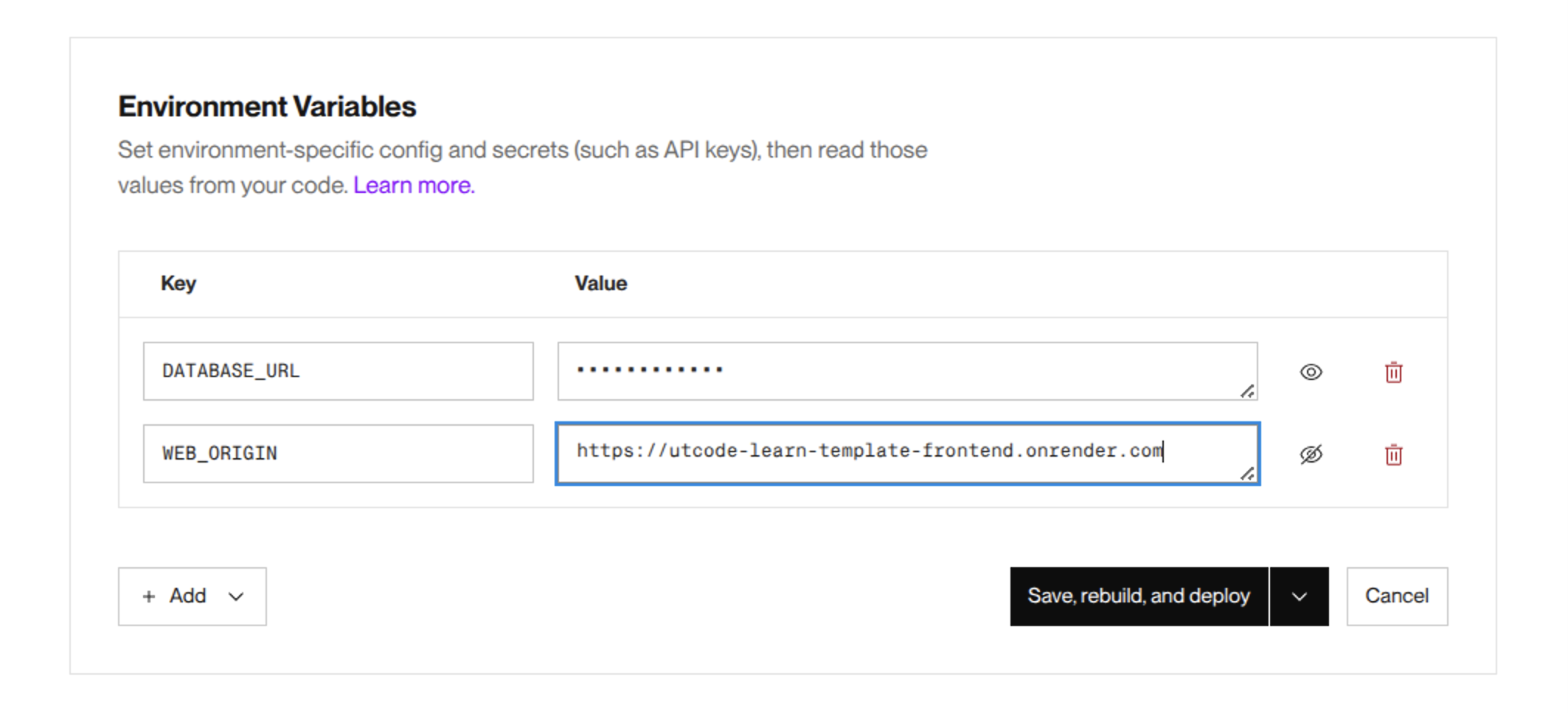 DATABASE_URLを設定し、環境変数WEB_ORIGINに先ほどデプロイしたフロントエンドのオリジンを設定します。