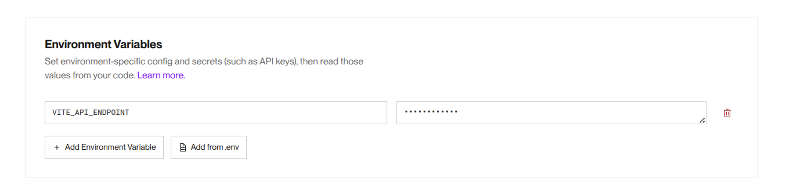VITE_API_ENDPOINTに先ほどデプロイしたバックエンドのURLを設定します。